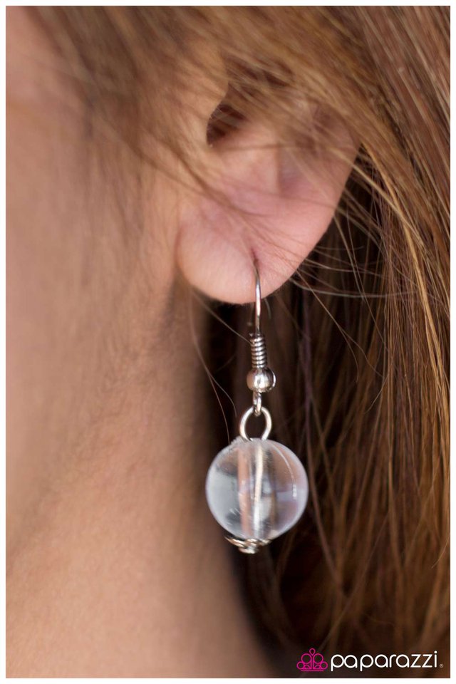 A large, flat White bead with a hint of marbled hues is the anchoring piece for a cluster of white and clear beads to swing freely. The clear beads in the cluster feature reflective, faceted edges that create a stunning light-catching display. Features an adjustable clasp closure. Sold as one individual necklace. Includes one pair of matching earrings.