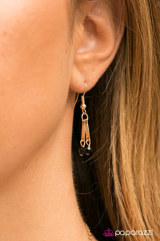 Faceted gold rods swing from gold bars that slide along a glistening gold chain. Glittery black beads attach to the bottom of the dangling rods, creating a flirtatious fringe below the collar. Features an adjustable clasp closure. Sold as one individual necklace. Includes one pair of matching earrings.