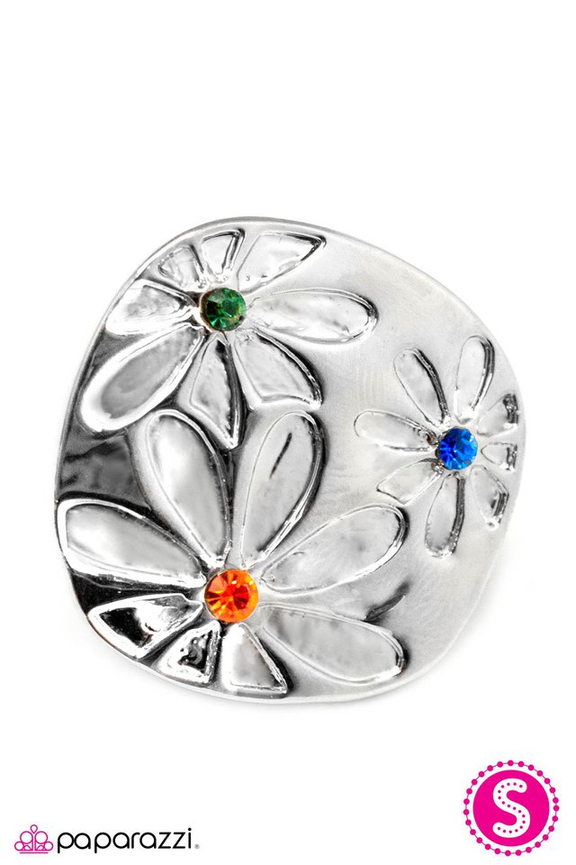 A flat silver plate is subtly etched with three flowers, each with a colorful rhinestone at its center. Sold as one individual ring.