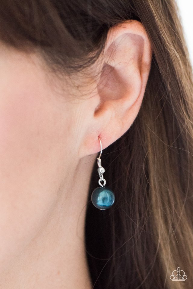 A pearly blue bead swings from the bottom of a silver chain, creating a dramatic pendant. Trestles of silver chains stream from the bottom of the bold pearl, creating a refined tassel. Features an adjustable clasp closure. Sold as one individual necklace. Includes one pair of matching earrings.