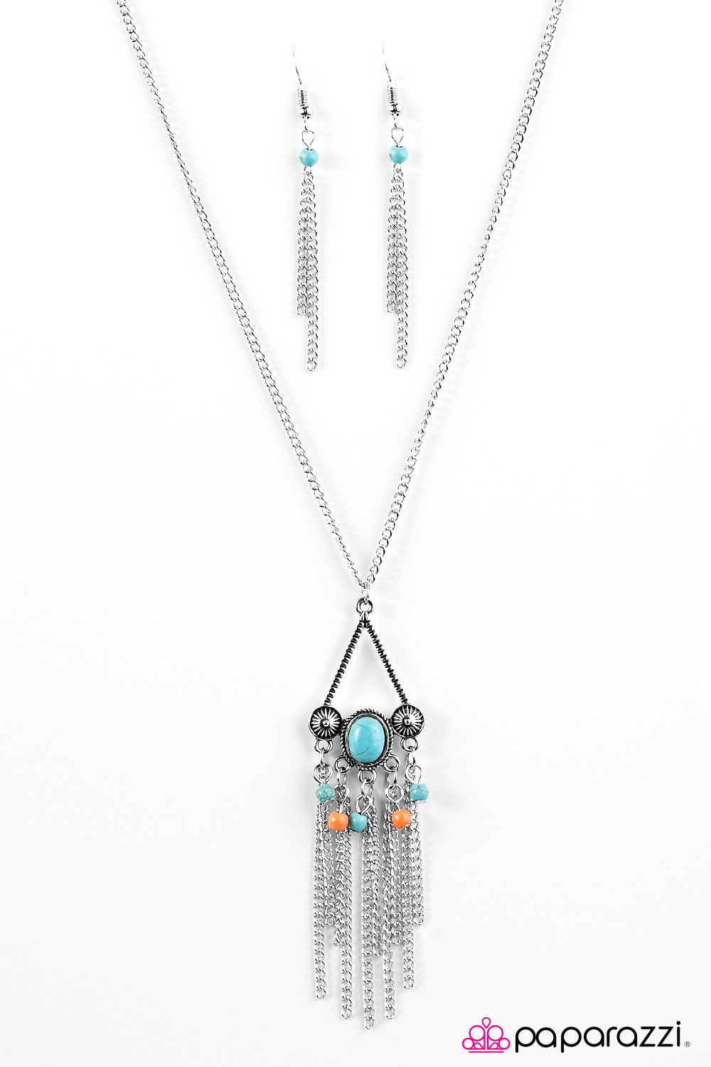 A refreshing turquoise stone is pressed into a triangular pendant in a simply seasonal fashion. Streams of shimmery chains cascade below a fringe of turquoise and orange stone beading, adding a colorful finish to the tribal inspired pendant. Features an adjustable clasp closure.