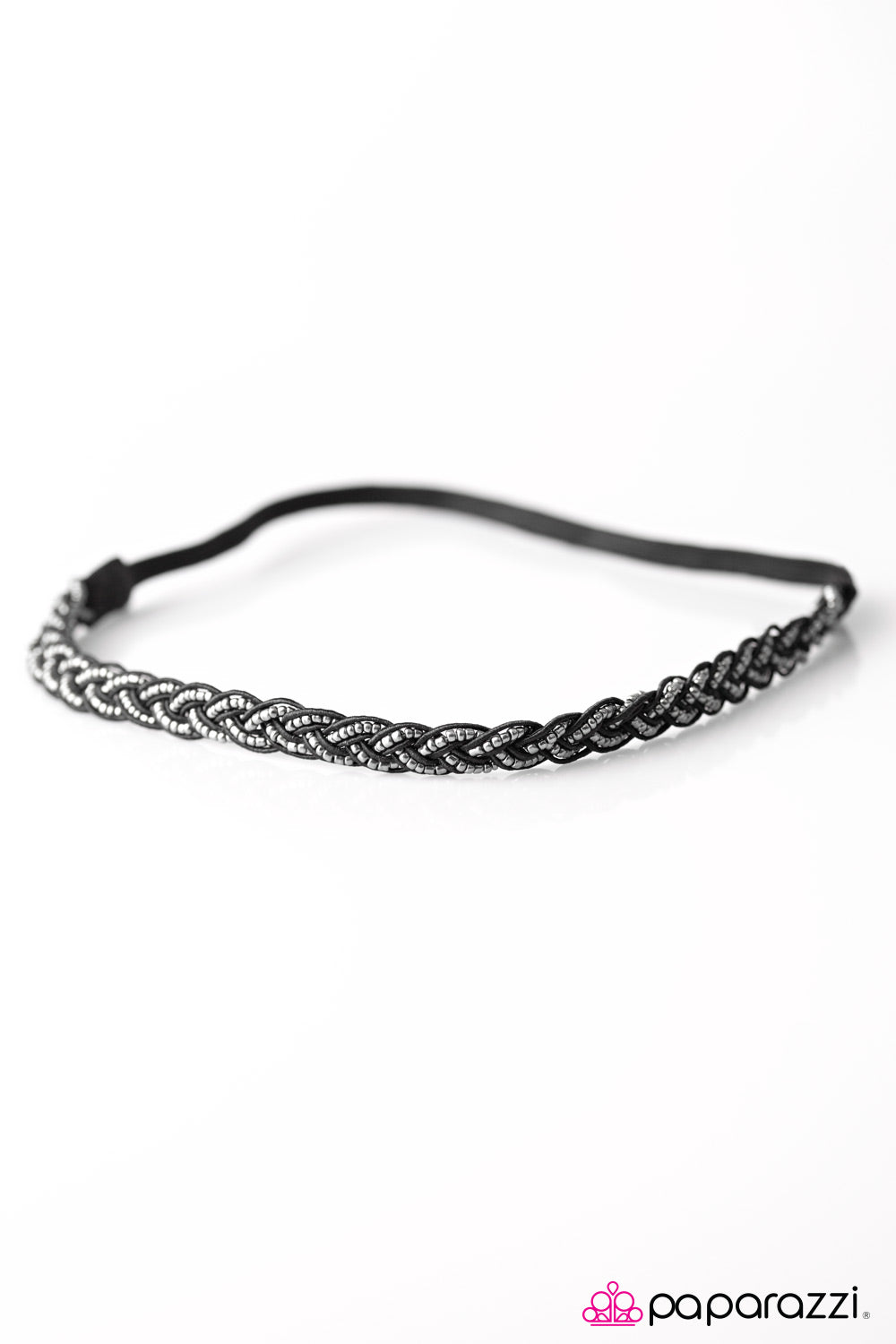 Strands of metallic seed beads and shiny black cording weave into a brilliant braid across the forehead.