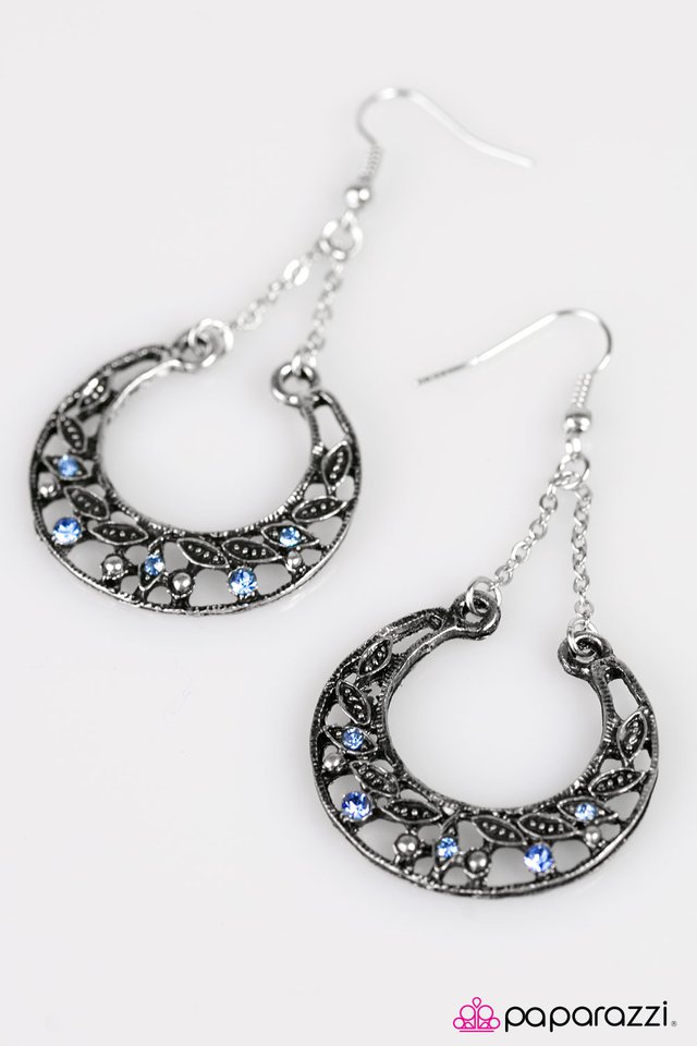 Adorned in silver foliage, a silver crescent swings from the ear in a whimsical fashion. Dainty blue rhinestones are sprinkled across the airy pattern for a shimmery finish. Earring attaches to a standard fishhook fitting. Sold as one pair of earrings.