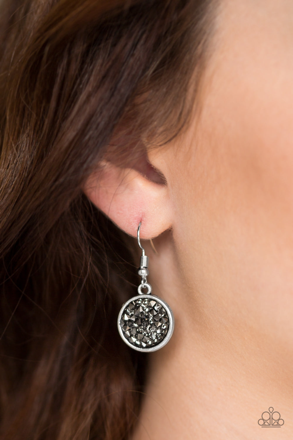 Glittery hematite and smoky rhinestones are sprinkled along a round silver frame, creating a dramatic pendant below the collar for a glamorous look. Features an adjustable clasp closure.