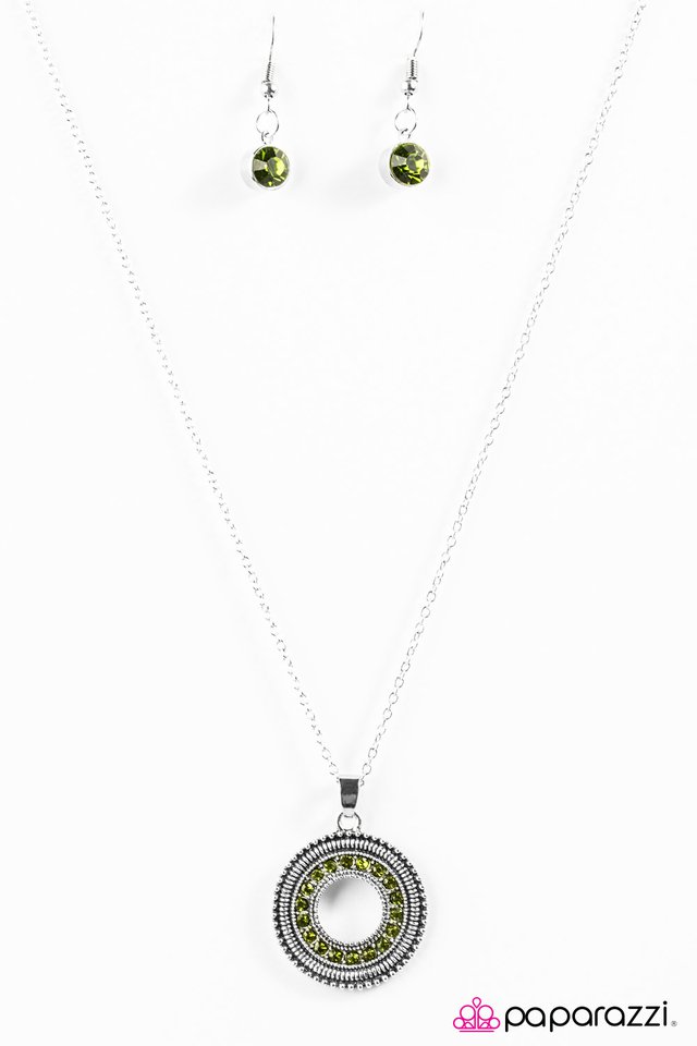 A glittery ring of green rhinestones encircles a textured silver frame, creating a sparkling pendant. Enhanced with an elongated silver chain, the shimmery display falls down the chest in a colorfully refined fashion. Features an adjustable clasp closure. Sold as one individual necklace. Includes one pair of matching earrings.