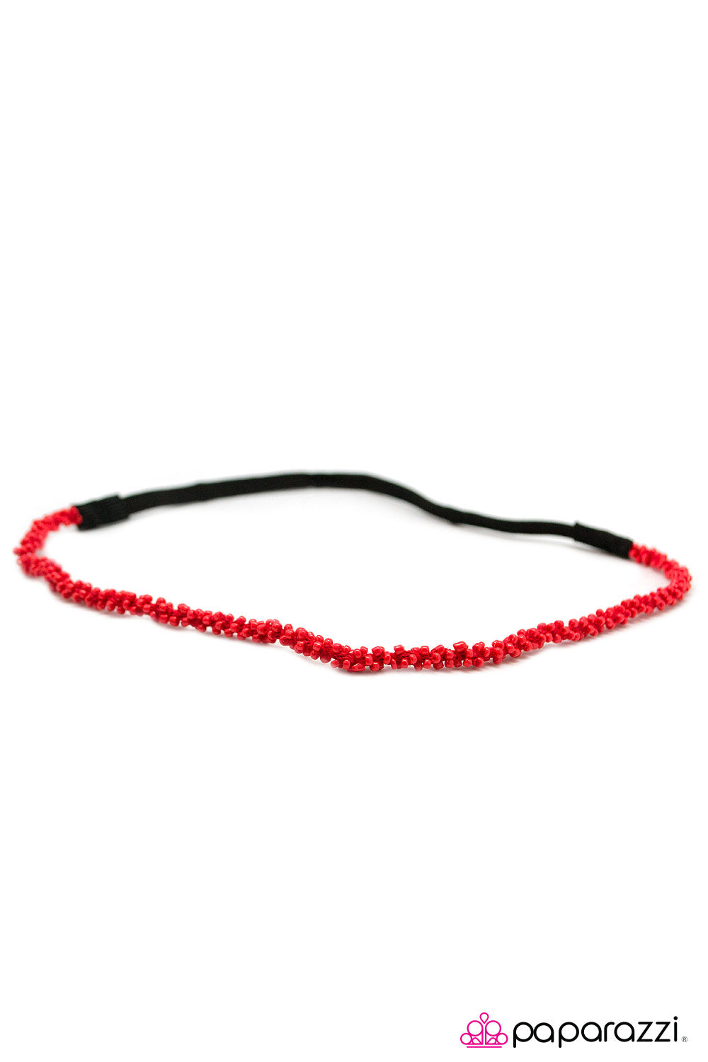 Tiny vibrant red seed beads are threaded along a red stretchy elastic band. The earthy coloring and twisted seed bead compilation evokes a chic boho vibe.