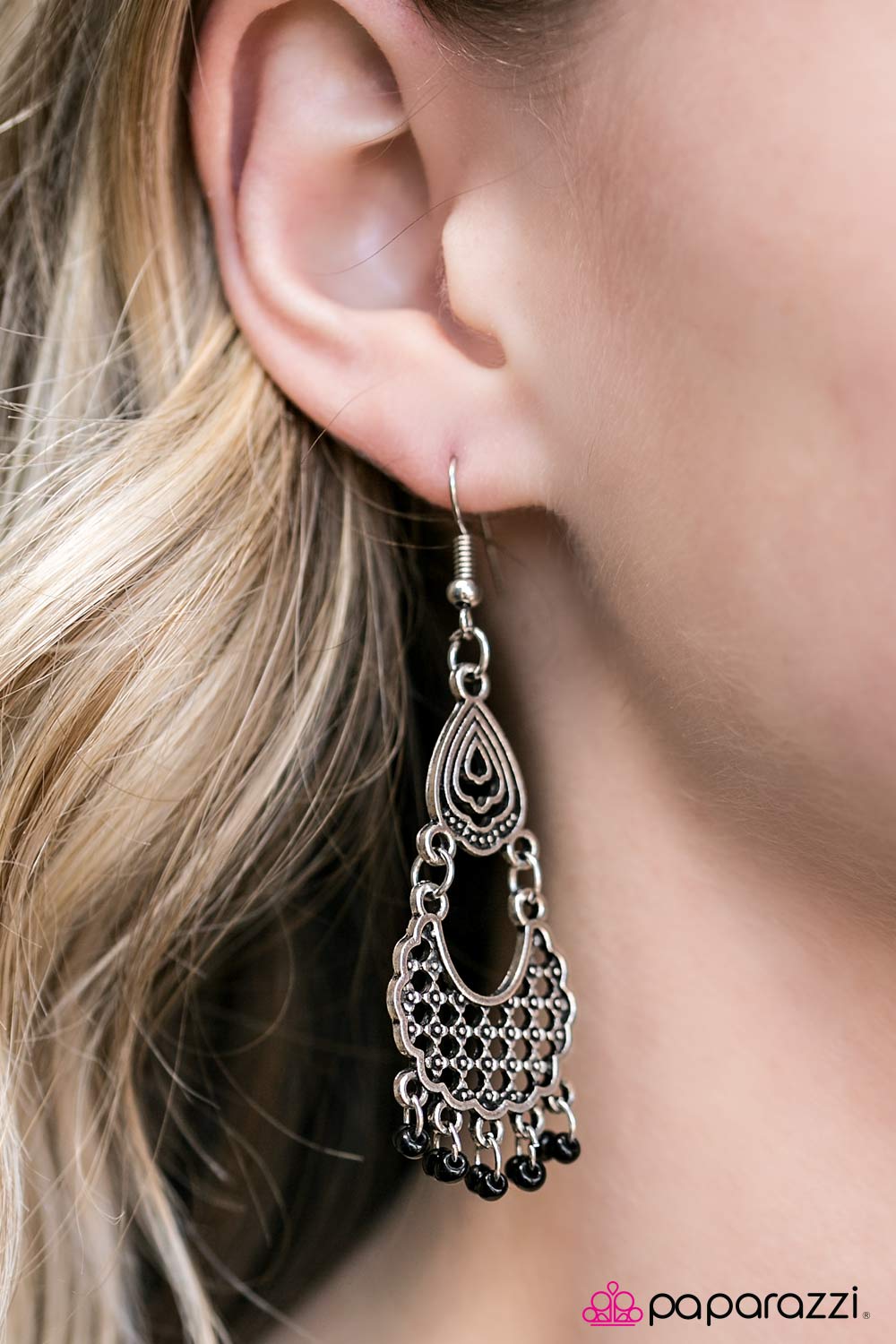 Dainty black beads swing from the bottom of an airy frame, creating a colorful beaded fringe. Brushed in a shimmery finish, the stenciled frame falls from the ear in a seasonal fashion. Earring attaches to a standard fishhook fitting.
