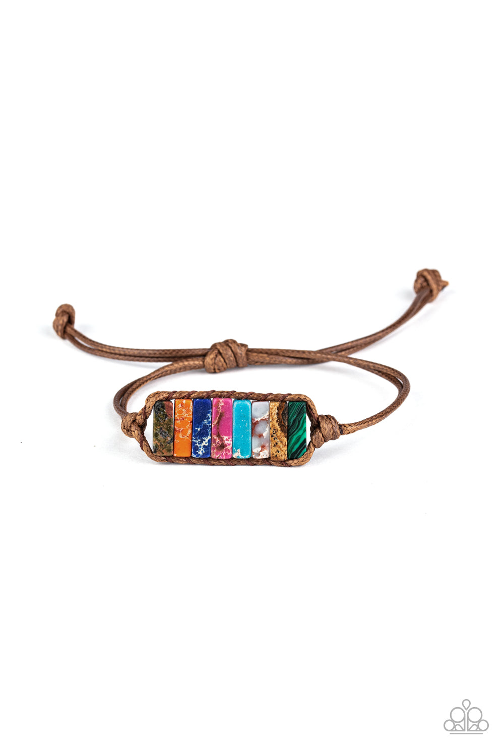Chiseled into tranquil rectangular shapes, a colorful row of natural stones are knotted in place around the wrist with a piece of brown cording for an earthy look. As the stone elements in this piece are natural, some color variation is normal. Features an adjustable sliding knot closure.