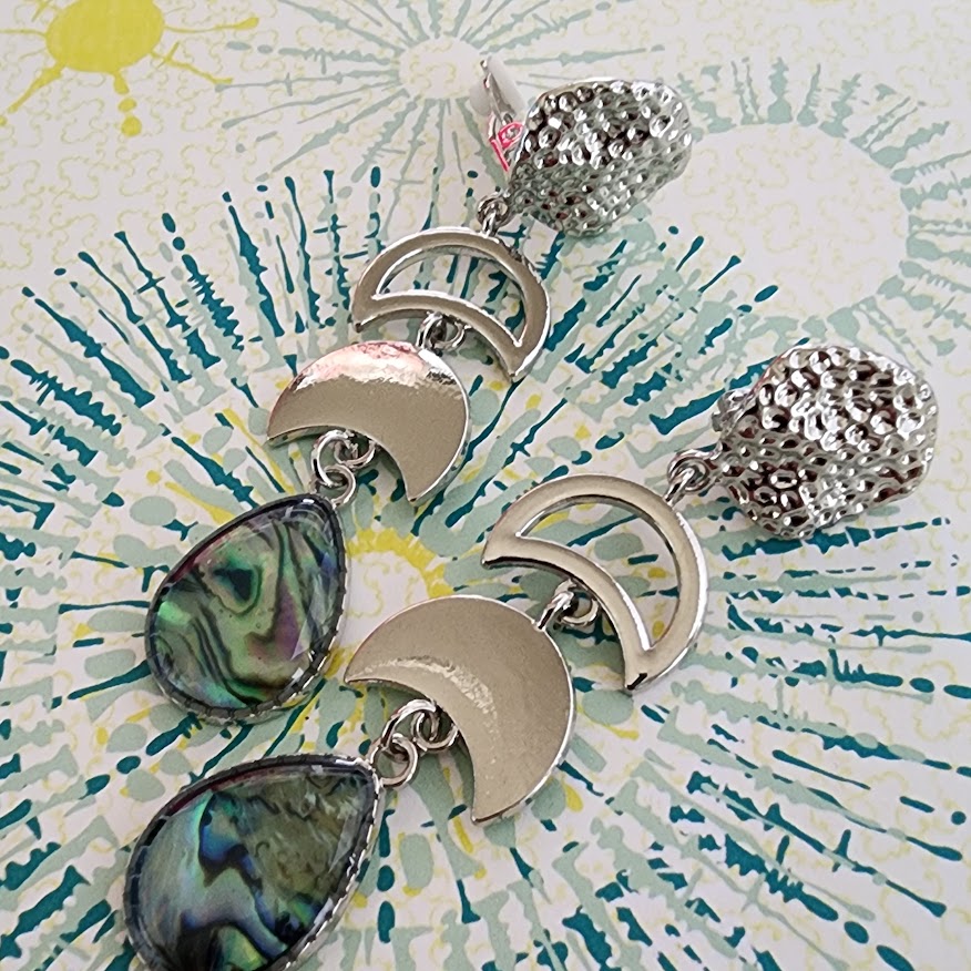 A hammered abstract silver disc gives way to two crescent moons, a silver outline, and a reflective silver for a cosmically chic look. An abalone shell swirled in dreamy, reflective hues of blue, purple, and green is set into a studded silver teardrop frame, cascading from the bottom of the design for a touch of celestial color. Earring attaches to a standard clip-on fitting.