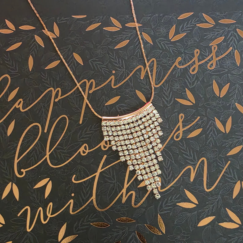 Gliding from a horizontal shiny copper fitting along a dainty shiny copper chain, a collection of glistening white rhinestones tapers down the collar in dainty layers, creating a classic chandelier-like display. Features an adjustable clasp closure.
