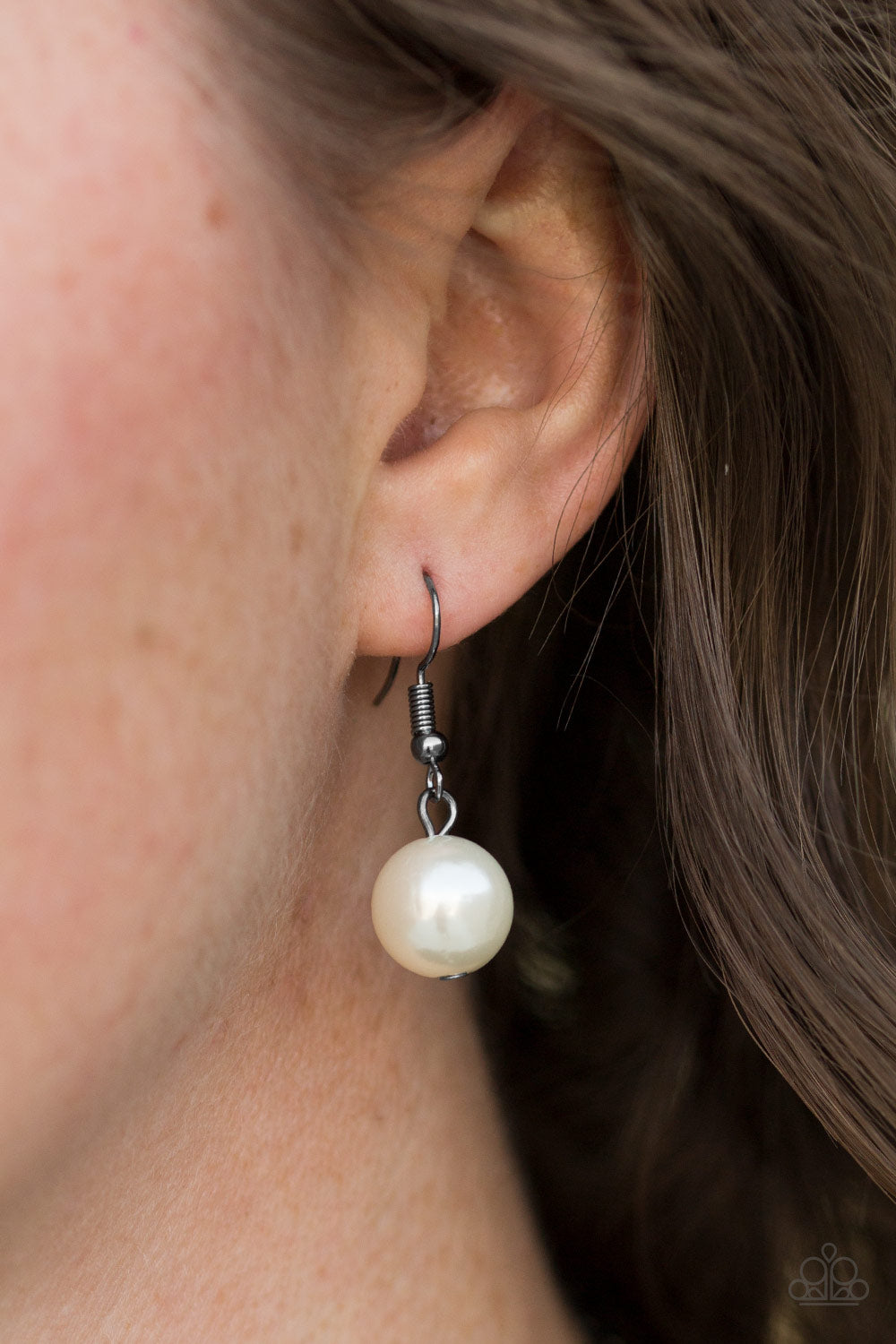 Luminescent pearls trickle along rows of glistening gunmetal chains, creating sassy layers across the chest. A lobster clasp hangs from the bottom of the design to allow a name badge or other item to be attached. Features an adjustable clasp closure.