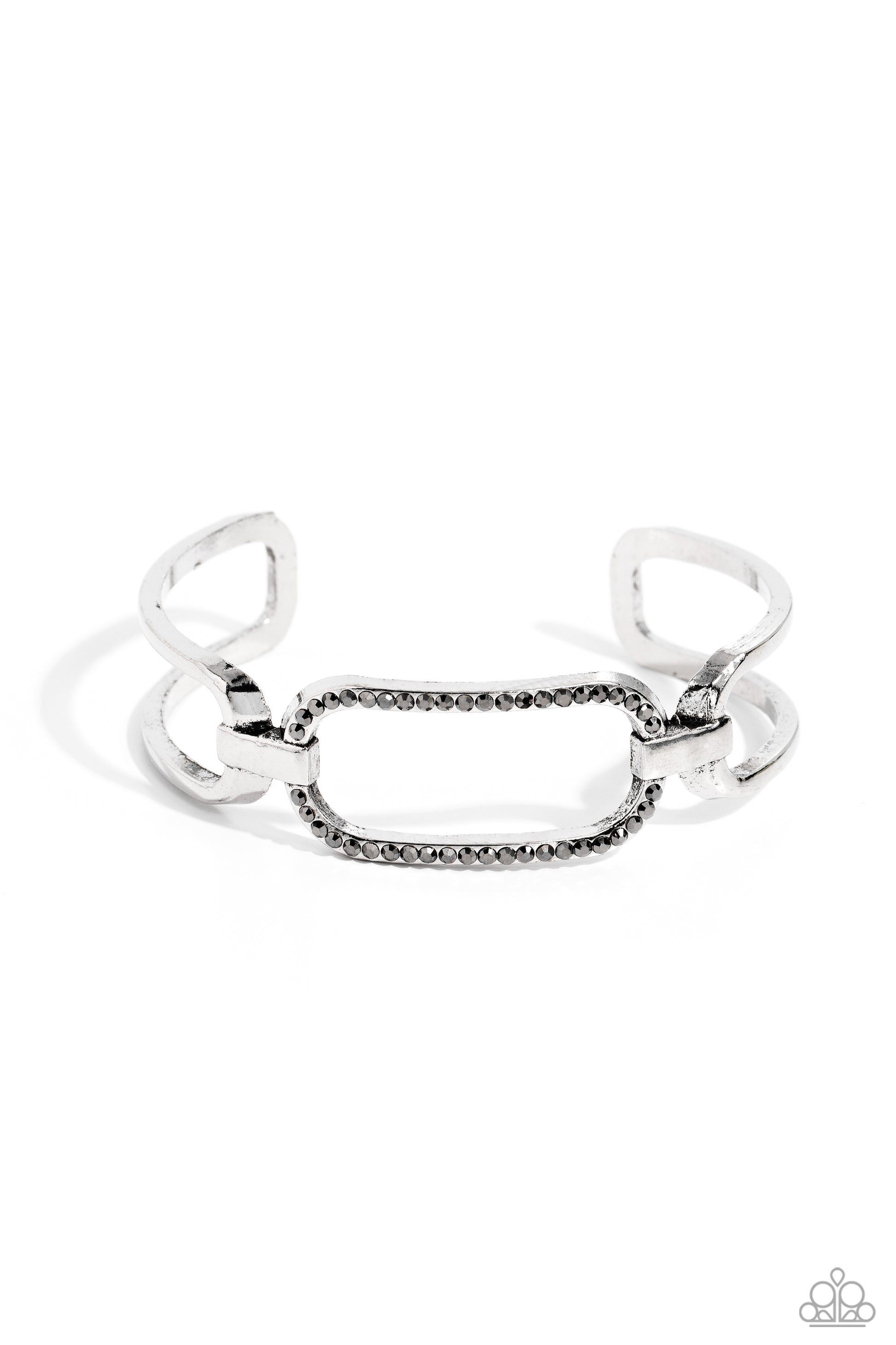 Airy link-like silver frames attach to a hematite rhinestone encrusted centerpiece, coalescing into a chic cuff around the wrist.