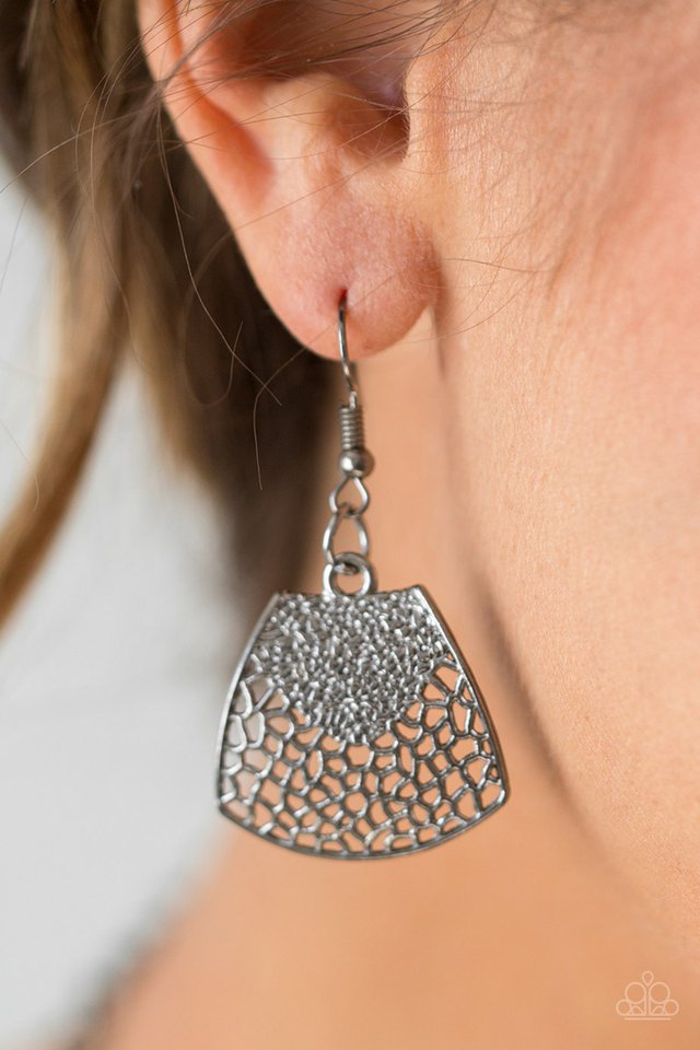 Rippling with metallic texture, shiny gunmetal frames link below the collar. Infused with airy patterns, the dramatic plates connect into a bowing statement piece. Features an adjustable clasp closure. Sold as one individual necklace. Includes one pair of matching earrings.