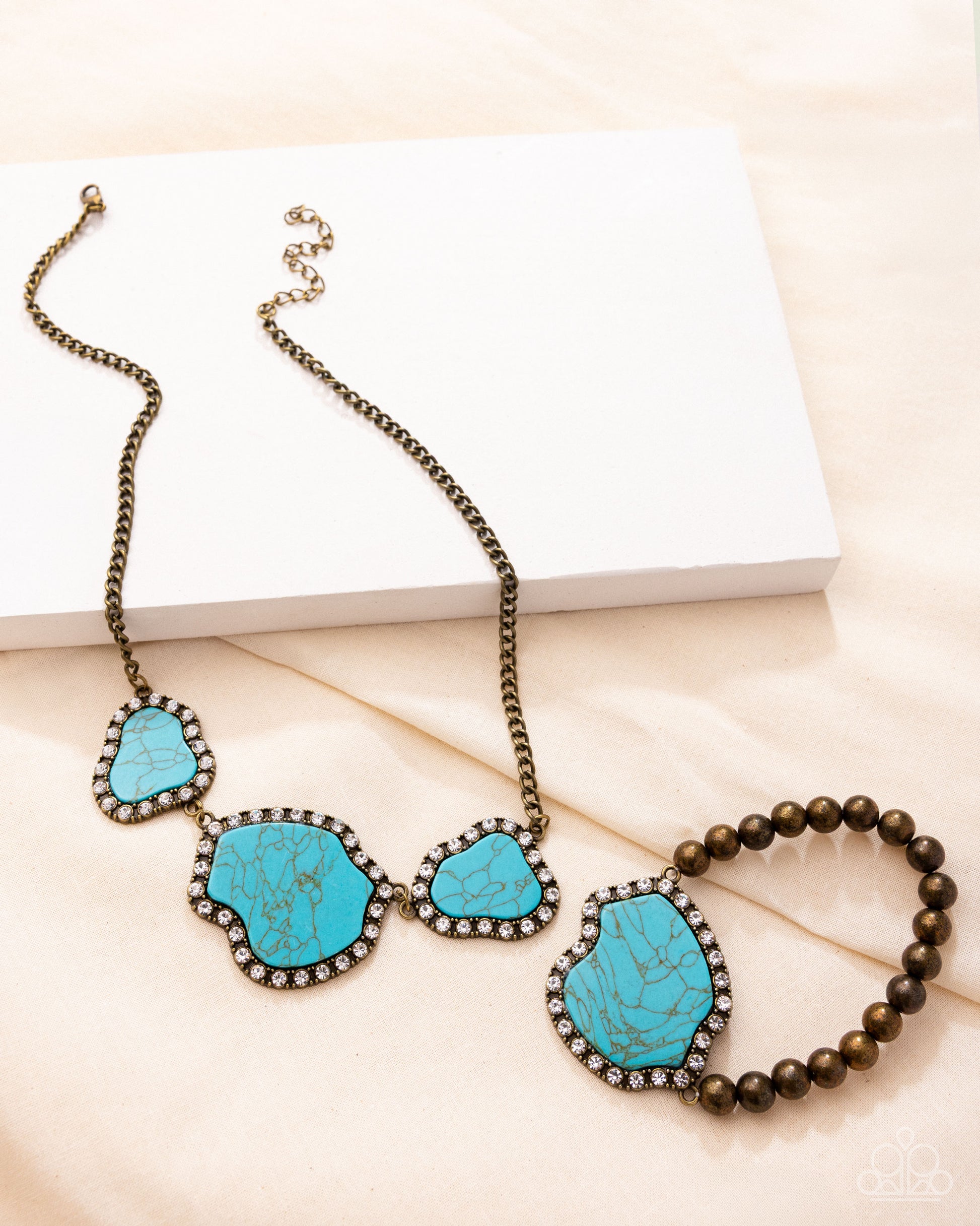 Infused along an elastic stretchy band, a collection of glistening brass beads coalesce around the wrist leading the eye to a flattened turquoise stone in an abstract cut, for a startling pop of earthy color. White rhinestones set inside brass-pronged frames, create the border around the stone for a shimmery finish. As the stone elements in this piece are natural, some color variation is normal.