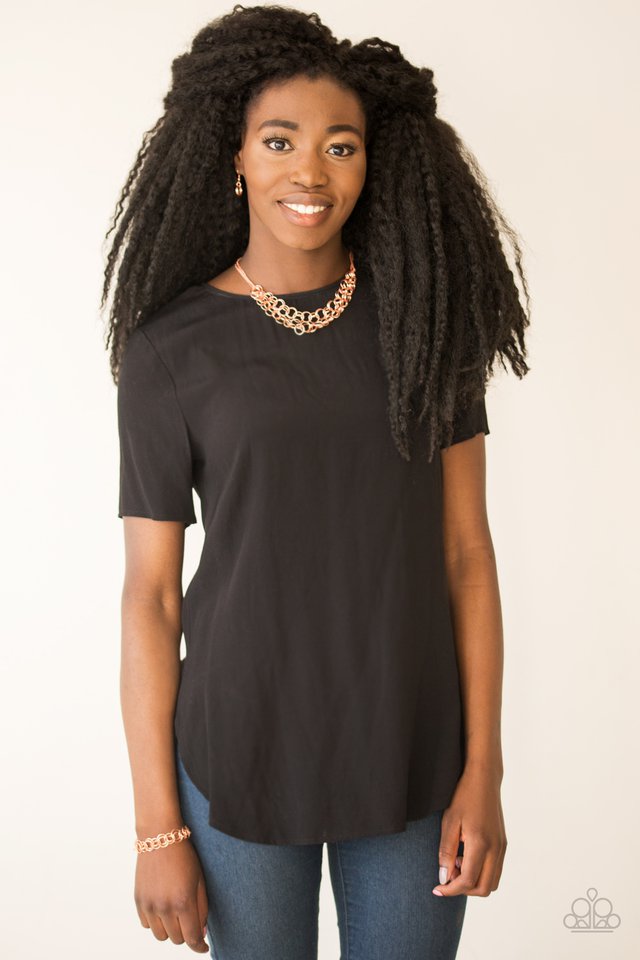 Varying in size, rows of shiny copper rings interlock across the wrist for a bold industrial look. Features an adjustable clasp closure. Sold as one individual bracelet.