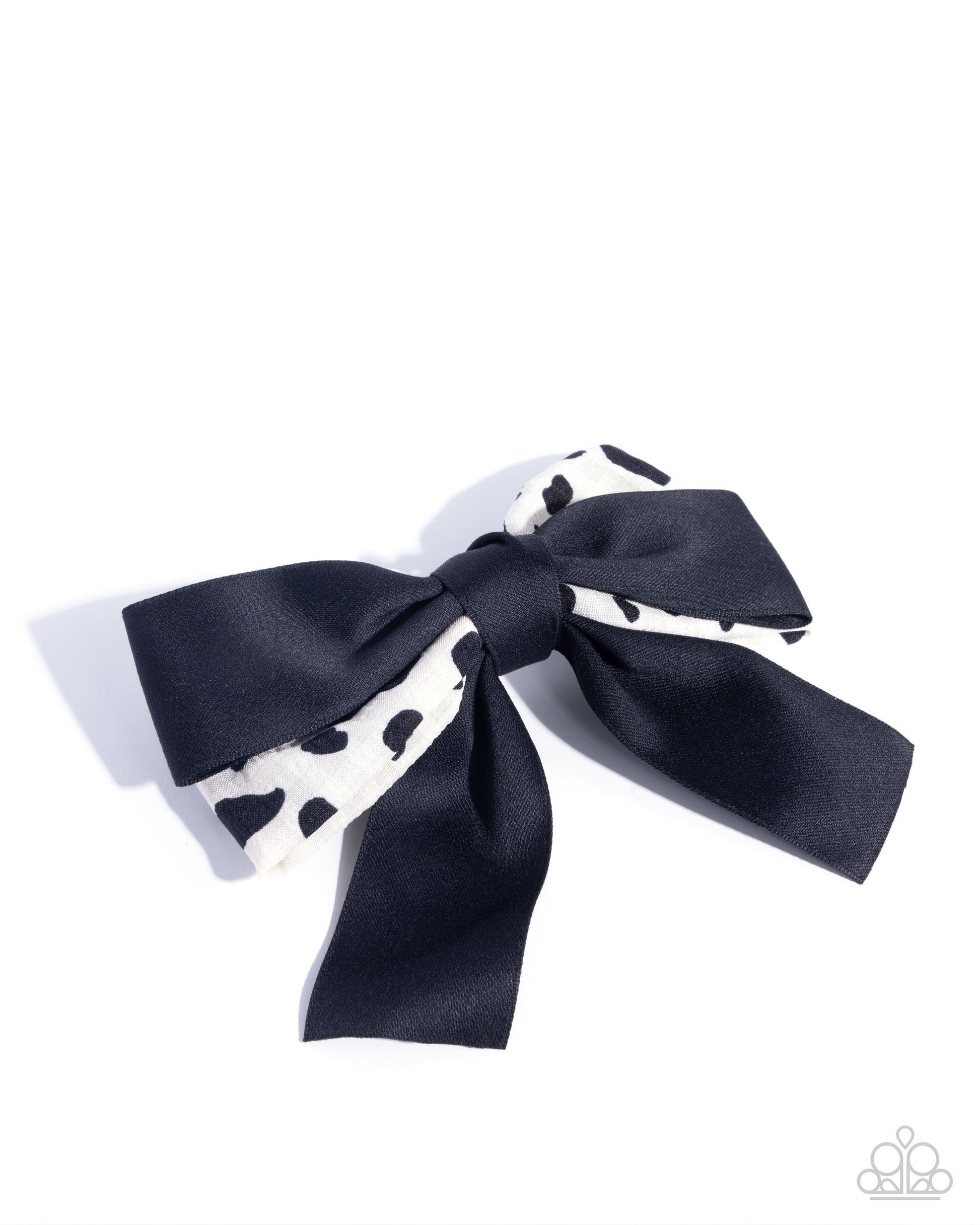 Featuring a cow print, a white ribbon is tied into a wild bow layered with a black bow for a standout centerpiece. Features a standard hair clip on the back.