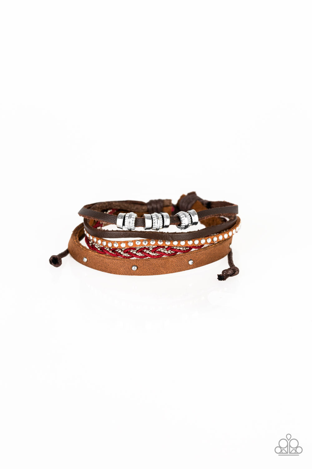 Featuring an array of silver accents, mismatched brown leather and suede bands layer across the wrist. Red cording and dainty silver ball chain braid together, adding a refreshing splash of color to the seasonal palette. Features an adjustable sliding knot closure.
