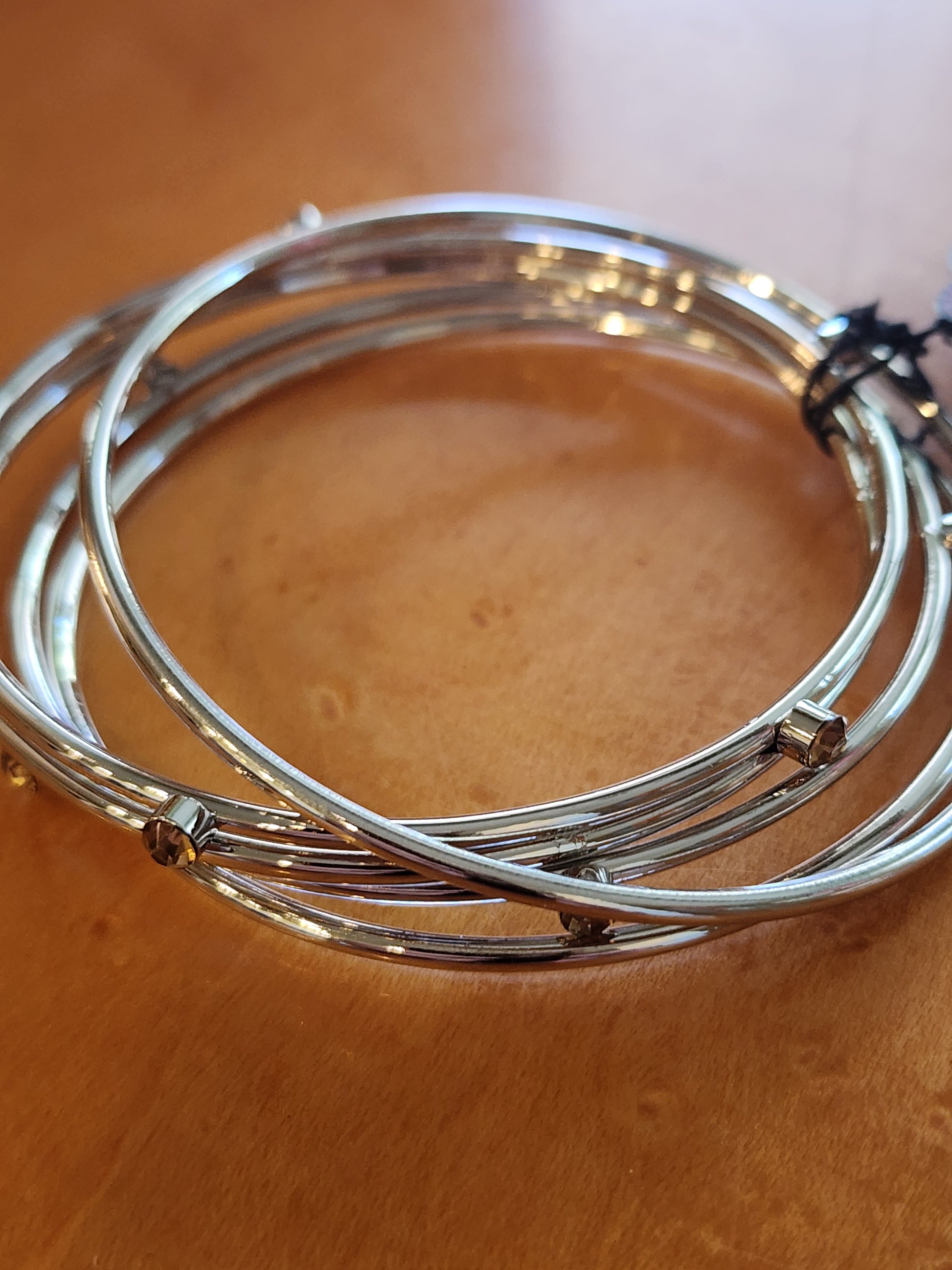 Three shiny silver and two topaz rhinestone encrusted bangles stack across the wrist for a refined look. Sold as one set of five bracelets.