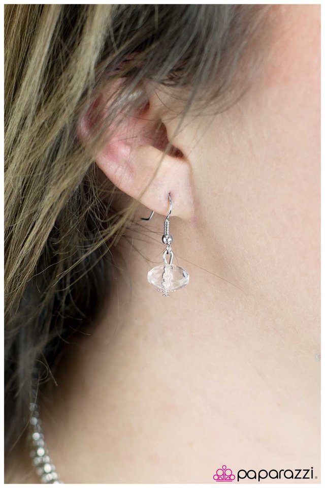 A large cluster of white translucent gems with faceted edges and metallic silver beads hang from a textured silver casing for an eye-catching look. Features an adjustable clasp closure. Sold as one individual necklace. Includes one pair of matching earrings.