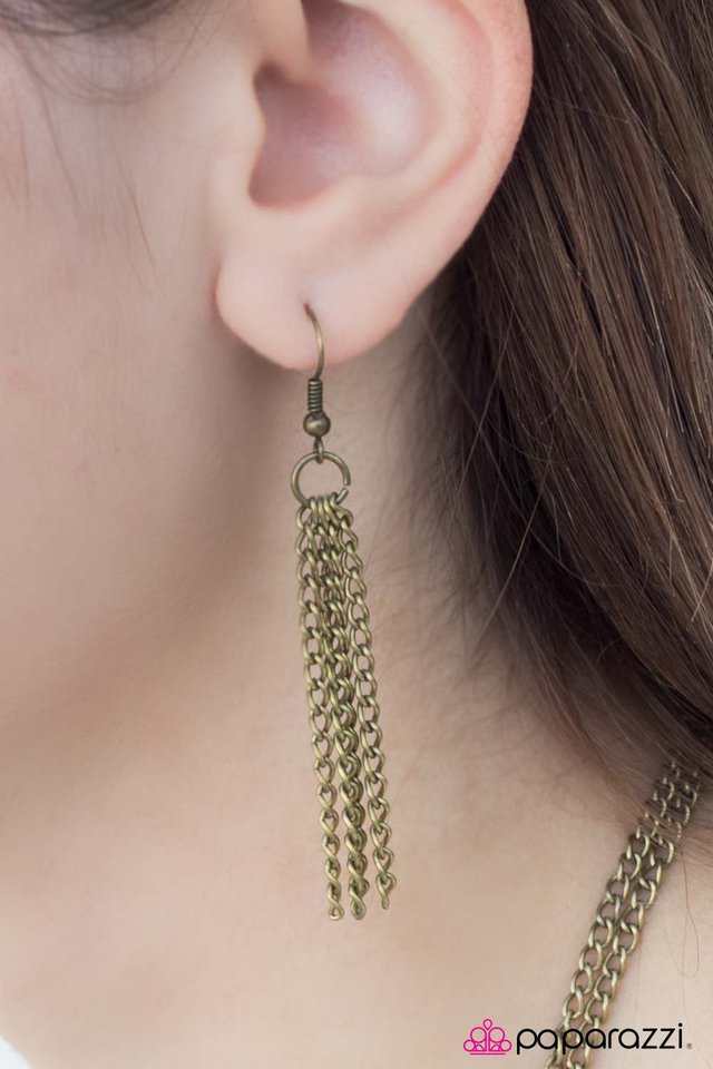 Streaming brass chains coalesce into a stunning industrial display. Chunky brass rings featuring an elegant twist are added to the display for eye-catching detail. Features an adjustable clasp closure. Sold as one individual necklace. Includes one pair of matching earrings.