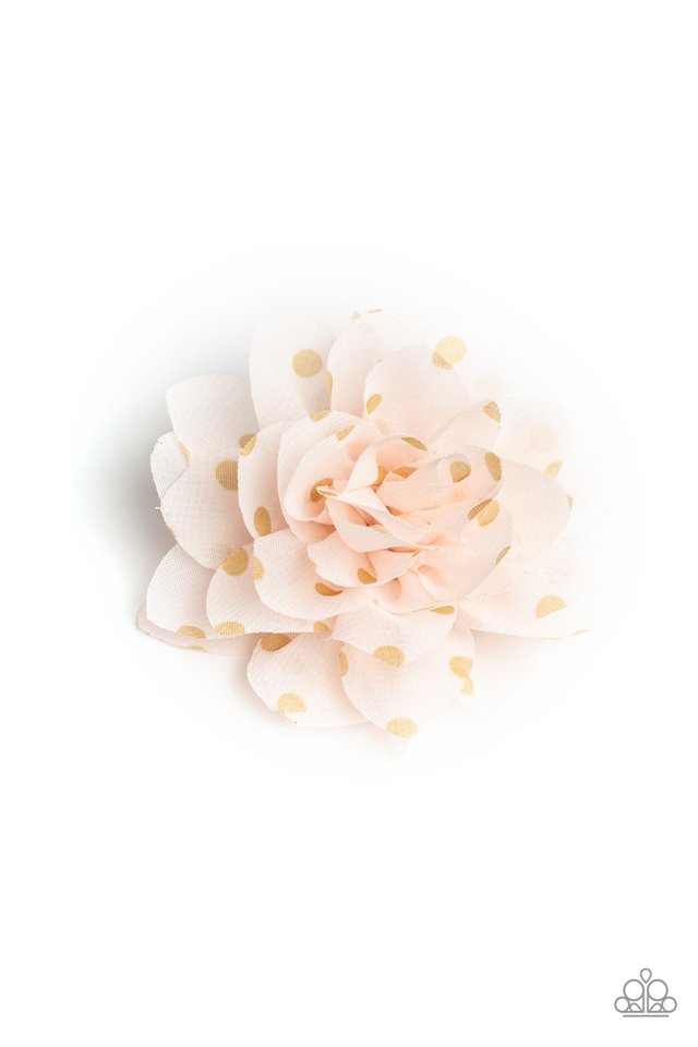 Dotted in dainty brown polka dots, peach chiffon petals gather into an airy flower for a seasonal look. Features a standard hair clip on the back. Sold as one individual hair clip.