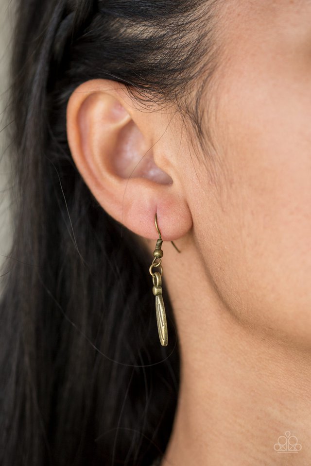 Stamped and embossed in tribal inspired patterns, three brass plates connect down the chest, creating a fiercely stacked pendant. Attached to twisted brass rods, ornate brass beads swing from the bottom of the lowermost plate, creating an eye-catching fringe. Features an adjustable clasp closure. Sold as one individual necklace. Includes one pair of matching earrings.