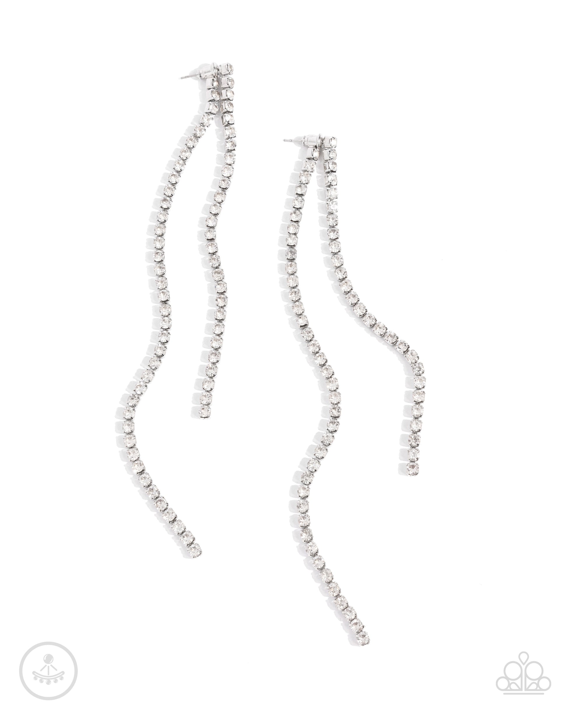 Encased in glistening silver fittings, dainty strands of glittery white rhinestones delicately attaches to a double-sided post cascading below and peeking out beneath the ear for a twinkly look. Earring attaches to a standard post fitting.