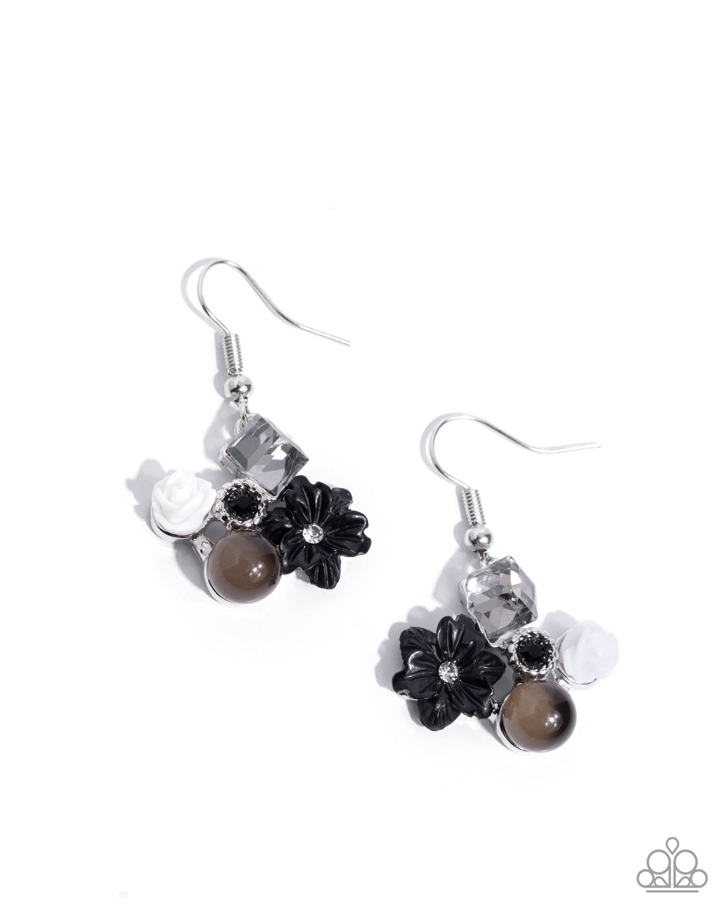 Featuring a collection of whimsical details, a white acrylic flower, a smoky cubed gem, a black-painted textured flower with a white rhinestone center, a black gem pressed in a textured floral frame, and a round brown bead that fades to black clusters and collects below the ear for a fantastical pop of shimmer and color. Earring attaches to a standard fishhook fitting.