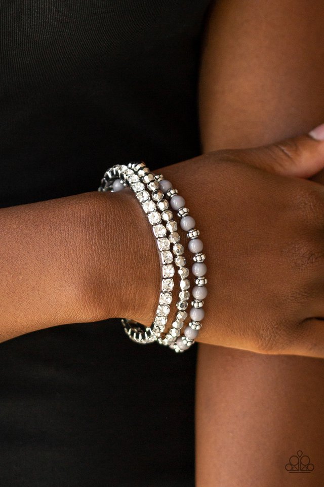 A refined array of hammered silver beads, dainty silver accents, polished gray beads, and a single strand of dazzling white rhinestones are threaded along stretchy bands around the wrist for a glamorous finish. Sold as one set of three bracelets.