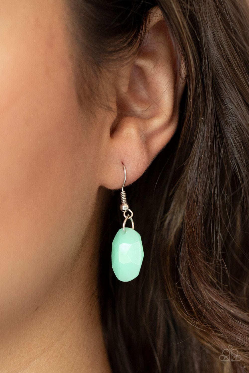 An oval green acrylic bead, shimmery silver rectangular frame, and white stone bead coalesce into a stacked pendant at the bottom of a shiny silver chain for a colorfully earthy look. Features an adjustable clasp closure.