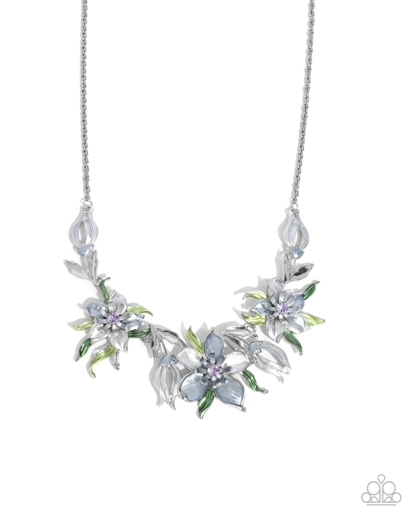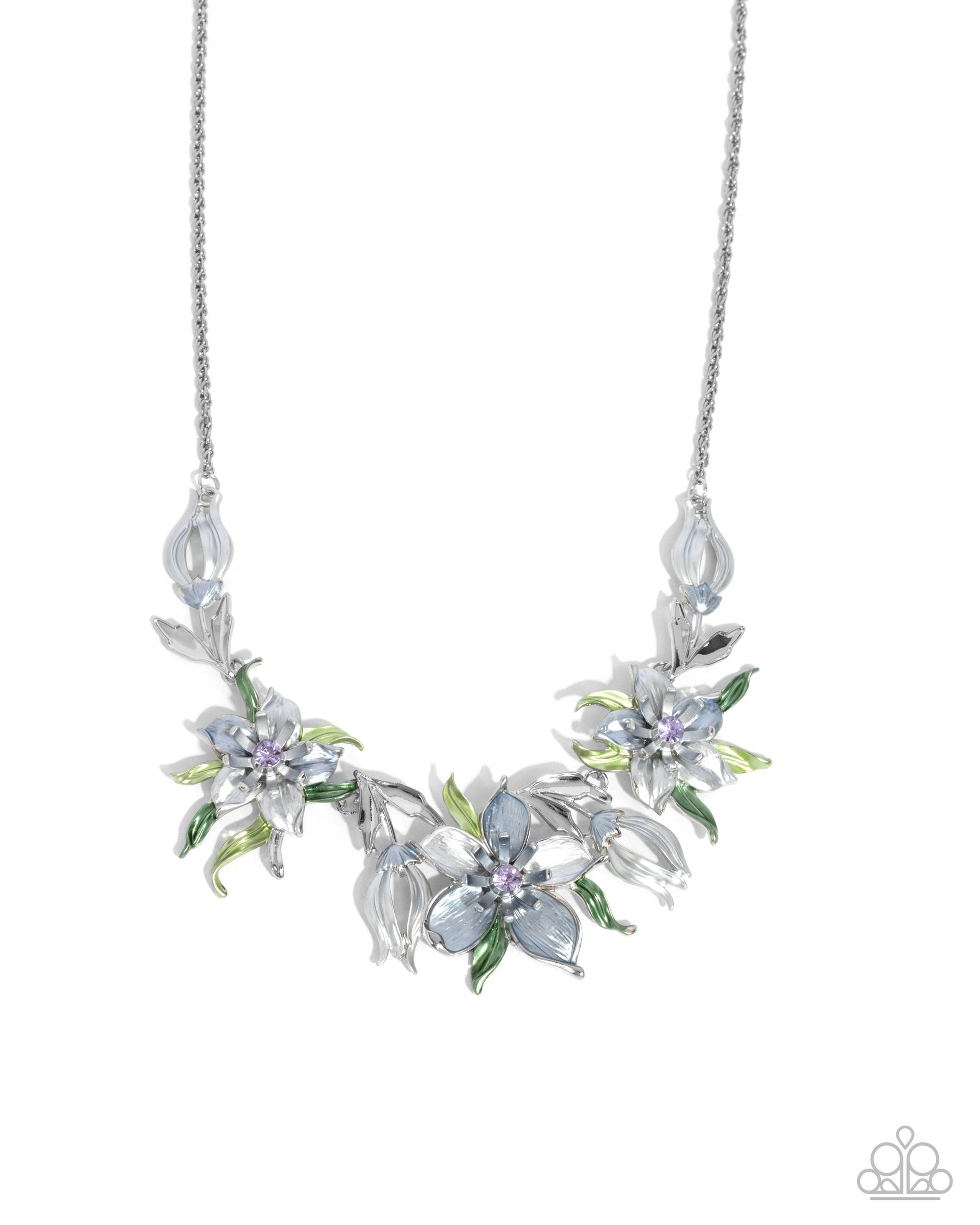 Featuring pearlized paint, an array of Winter Sky and silver flowers with silver and green multicolored painted leaves and soft violet gem-embellished floral centers bloom and flourish from a dainty, twisted silver chain below the neckline. Features an adjustable clasp closure.