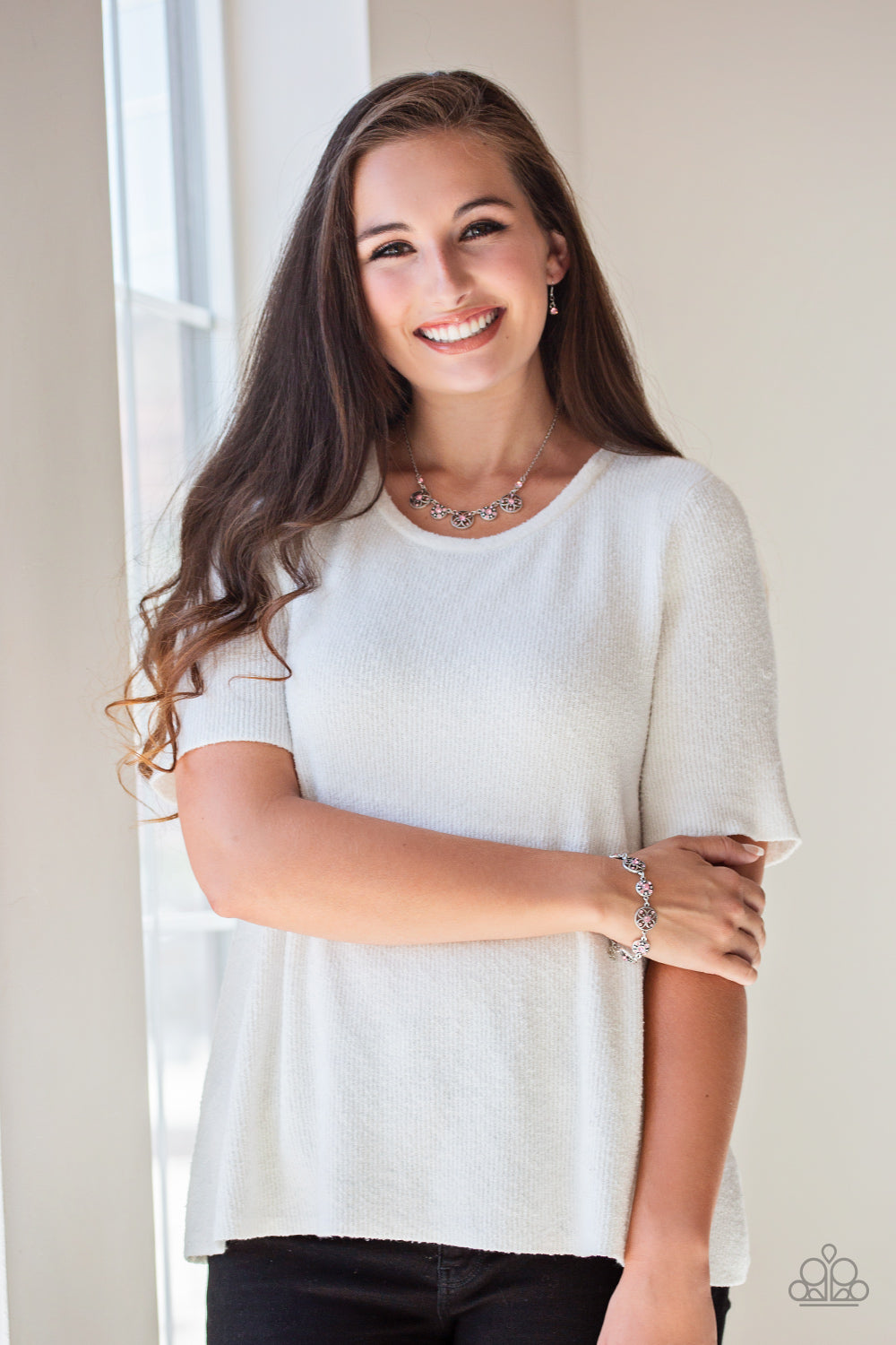 Dotted with glittery pink rhinestones and dainty silver studs, flowery medallion-like frames link around the wrist for a whimsical look. Features an adjustable clasp closure.