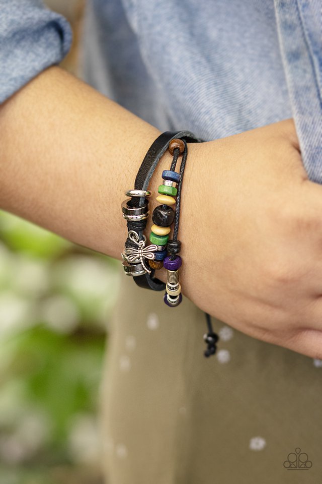 Featuring colorful wooden beads, shiny metallic accents, and a shimmery dragonfly charm, mismatched strands of black cording and leather layer across the wrist for a whimsical fashion. Features an adjustable sliding knot closure. Sold as one individual bracelet.