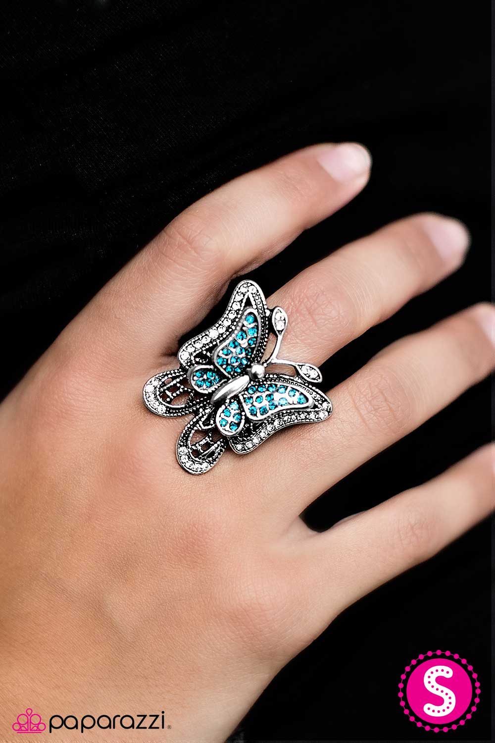 Dazzling white and blue rhinestones are sprinkled across the wings of a silver butterfly, creating a whimsical frame atop the finger.