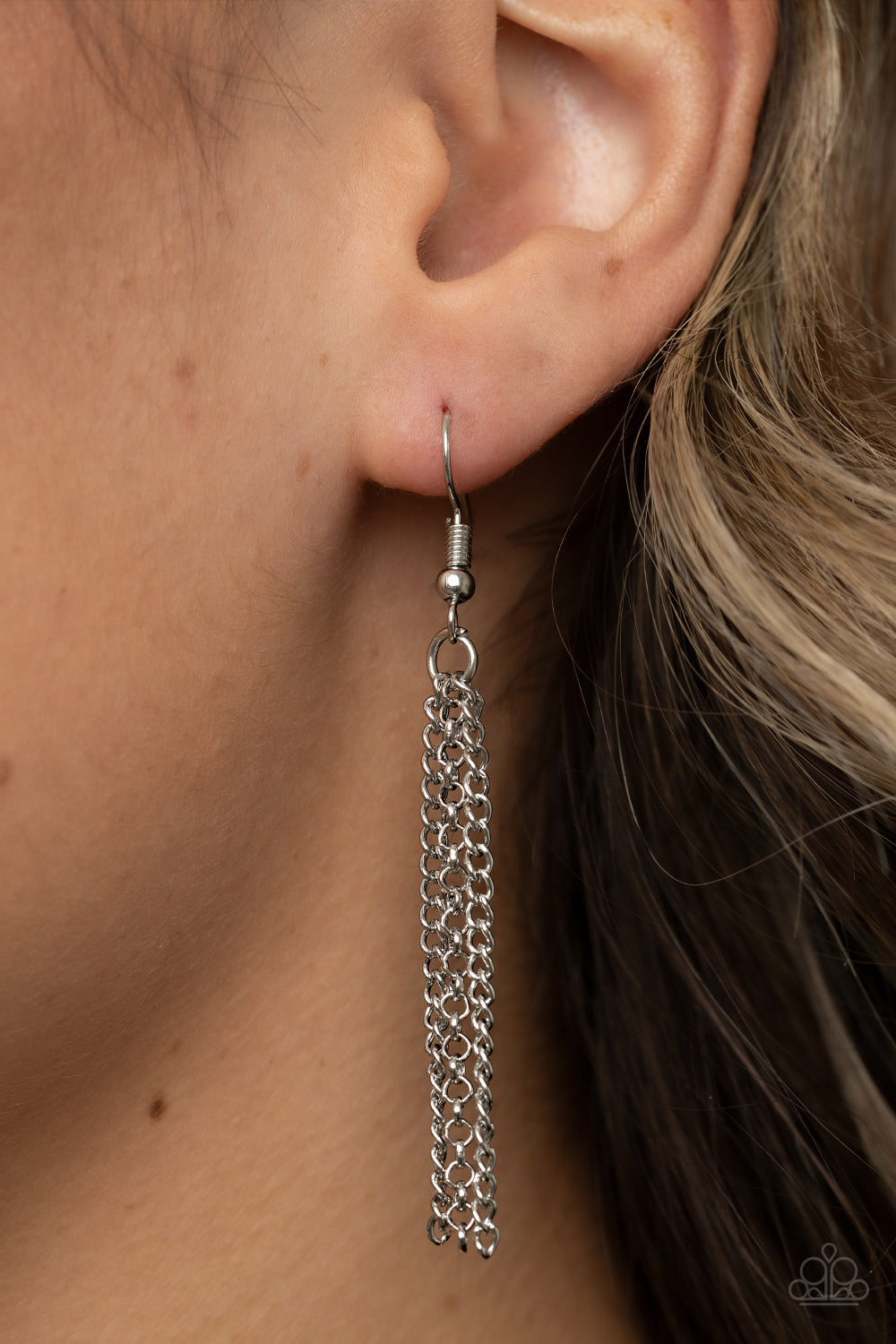 A faceted geometric Fire Whirl bead is pressed into a stacked southwestern inspired silver frame at the bottom of an extended silver chain. A shimmery silver chain tassel swings from the bottom of the display, adding whimsical movement. Features an adjustable clasp closure.