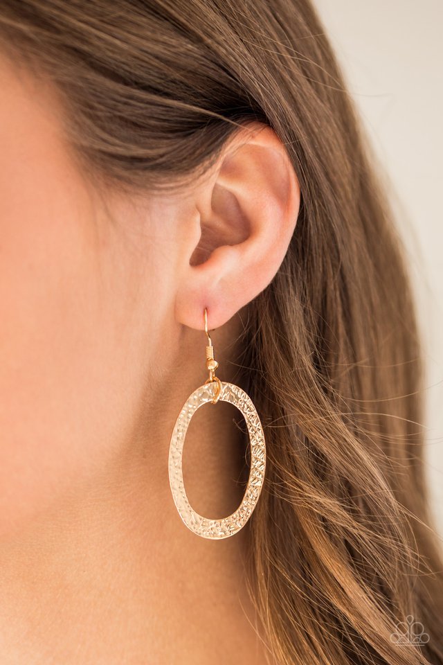 Delicately hammered in shimmery textures, two rows of glistening gold hoops layer down the chest for a sleek look. A lobster clasp hangs from the bottom of the design to allow a name badge or other item to be attached. Features an adjustable clasp closure. Sold as one individual lanyard. Includes one pair of matching earrings.