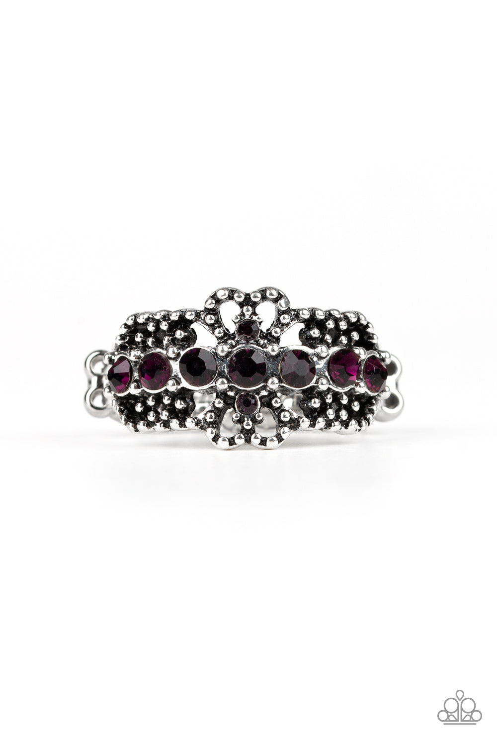 Dotted silver filigree coalesces into an ornate band. The center of the frilly frame is encrusted in a glittery row of purple rhinestones for a refined finish. Features a dainty stretchy band for a flexible fit.