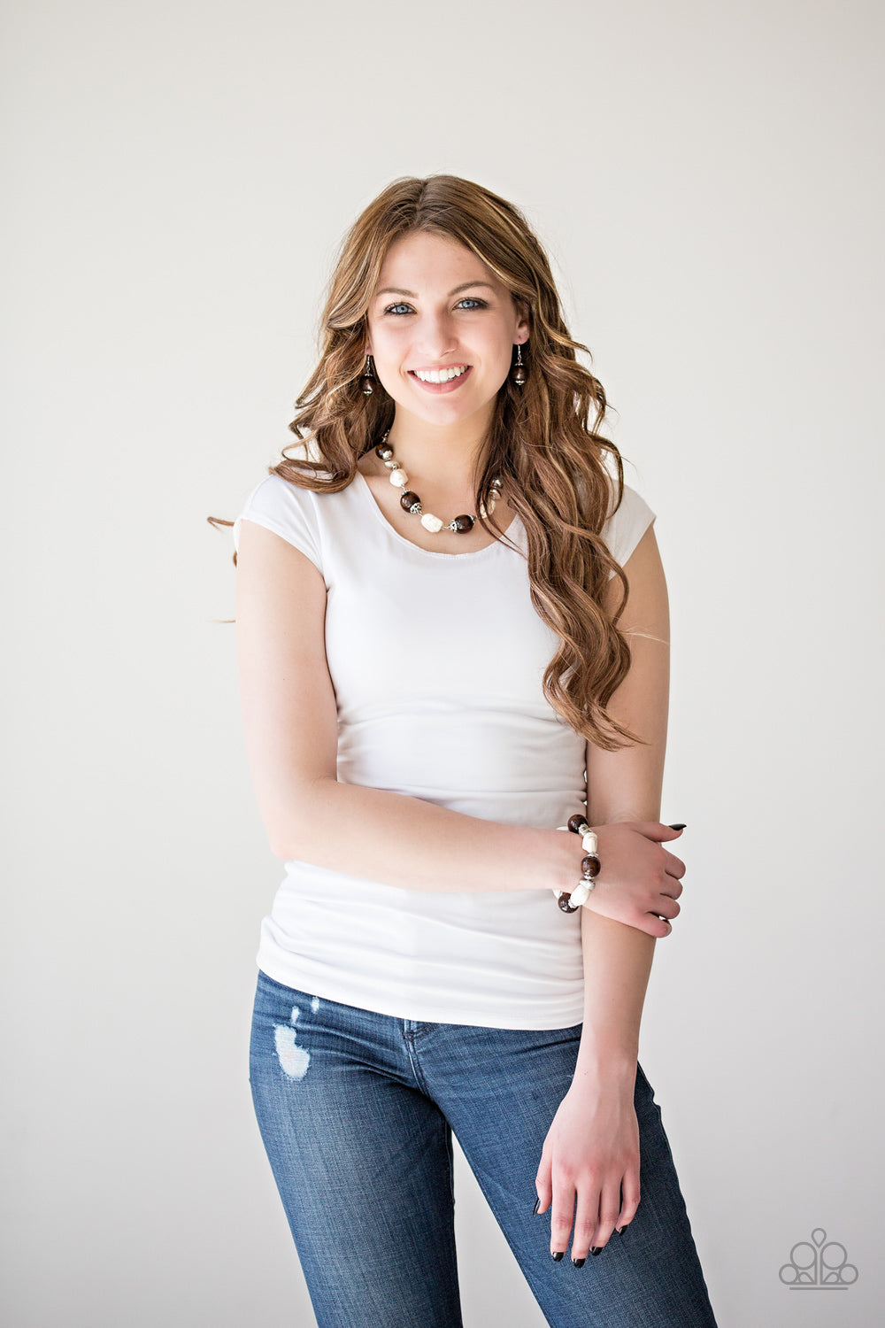 Infused with ornate silver accents, refreshing white stones and earthy wooden beads are threaded along a stretchy elastic band for a seasonal look.