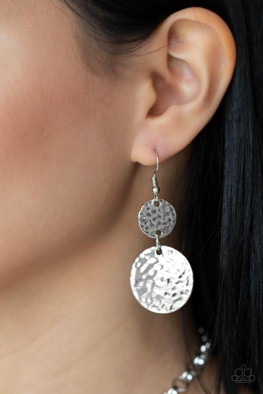 An earthy collection of hammered silver discs, black stone accents, and bold silver hoops link with sections of chunky and mismatched silver chains across the chest, creating a seasonal display. Features an adjustable clasp closure.