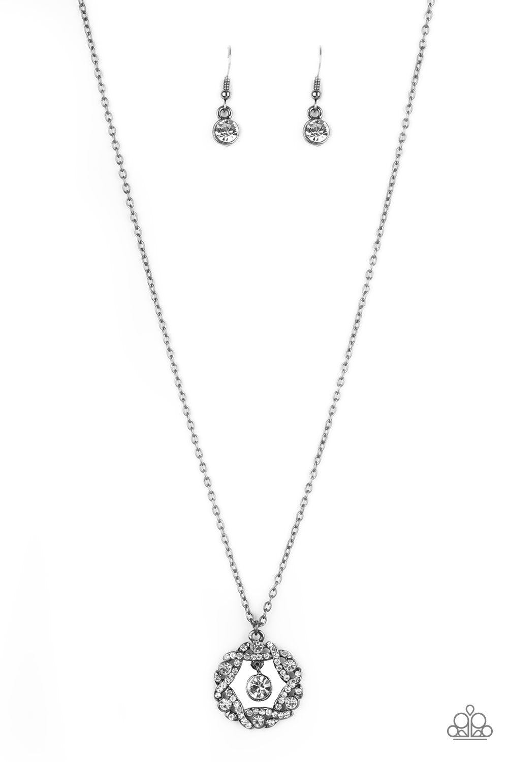 A braided wreath of gunmetal crisscrosses into a shimmering pendant at the bottom of a chain. A solitaire rhinestone is suspended inside the circular frame, creating the illusion of a floating gem.