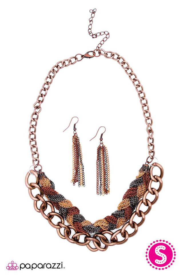 A braid of gunmetal, copper, and gold chains is layered with a strand of oversized copper links at the bottom of a copper chain. Features an adjustable clasp closure. Sold as one individual necklace. Includes one pair of matching earrings.