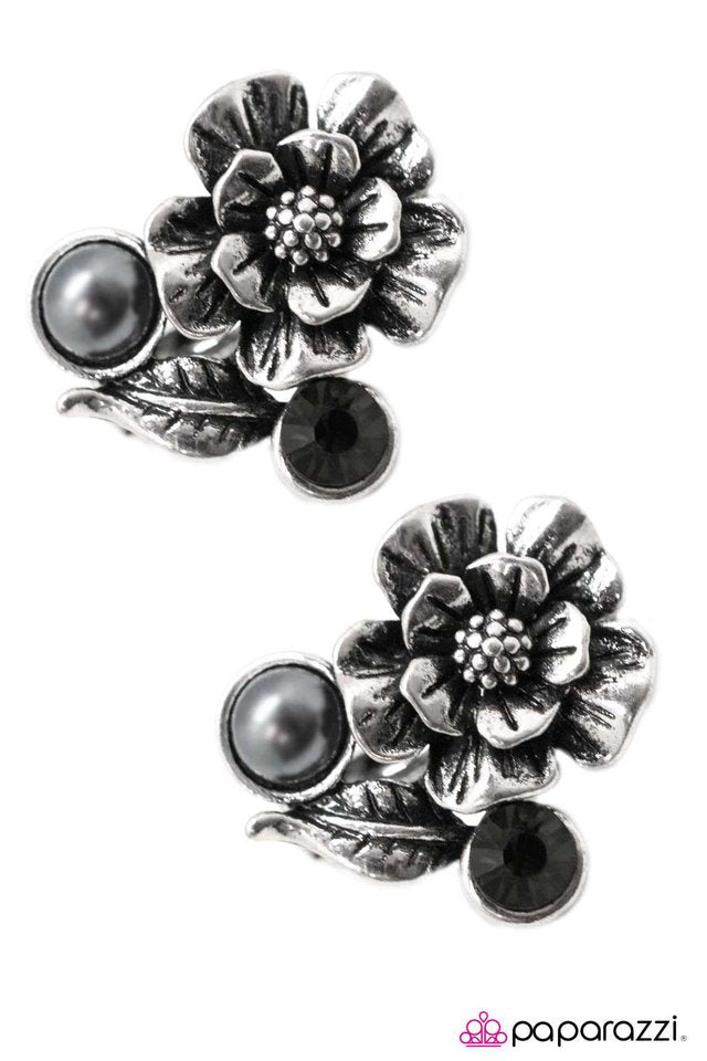 A dazzling smoky rhinestone and a pearly gray bead flank a shiny silver leaf beneath a large silver blossom. Brushed in an antique shimmer, the charming floral display is etched in lifelike textures for a whimsical finish. Earring attaches to a standard clip-on fitting. Sold as one pair of clip-on earrings.