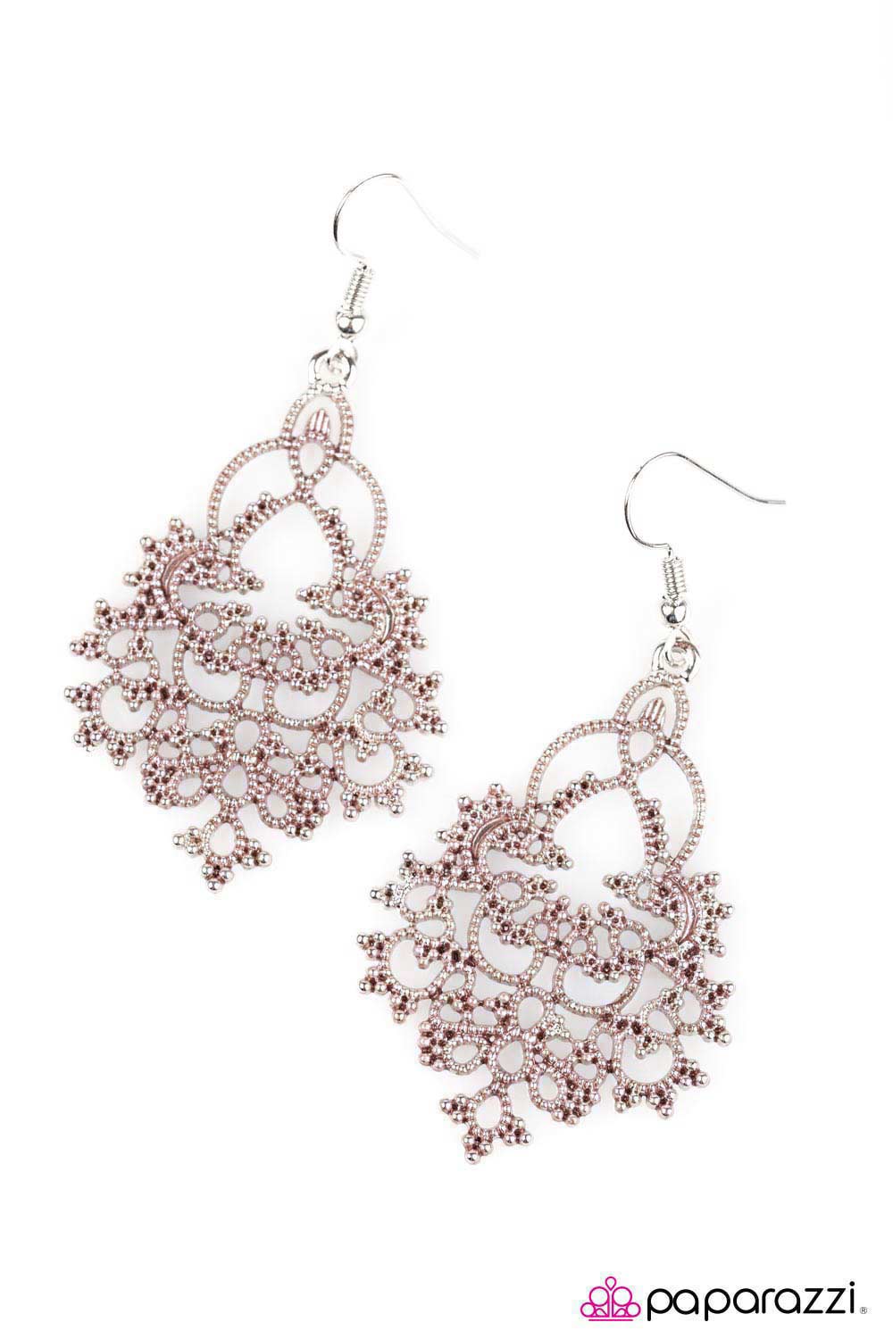 Brushed in a subtle brown finish, dotted filigree swirls into a whimsical frame. The airy palette and detailed pattern adds a feminine finesse to the colorful lure. Earring attaches to a standard fishhook fitting.