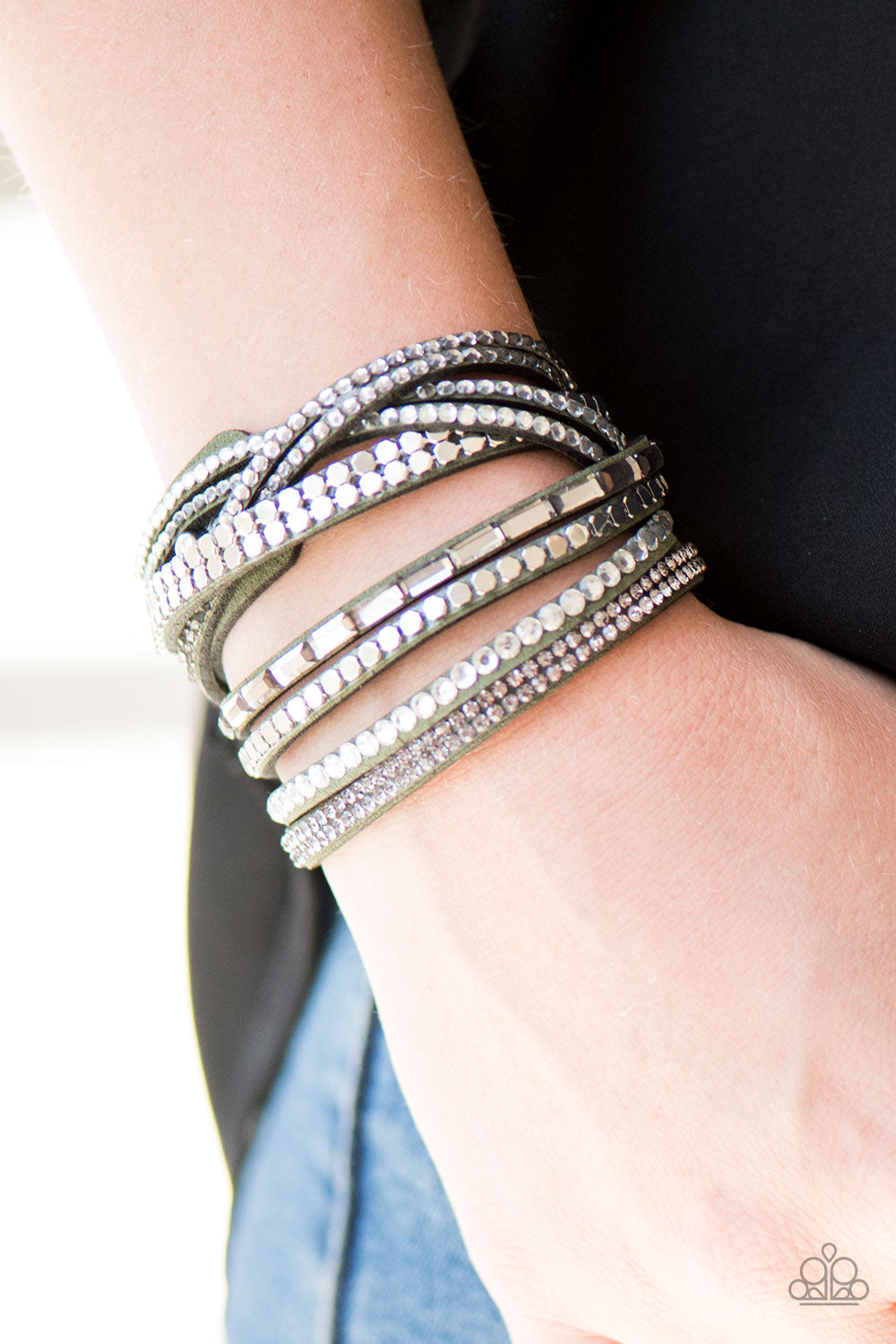 A mishmash of smoky and white rhinestones, flat silver beads and sparkling emerald-cut gems are sprinkled along strands of green suede for a sassy look. The elongated design allows for a trendy double wrap around the wrist. Features an adjustable snap closure.