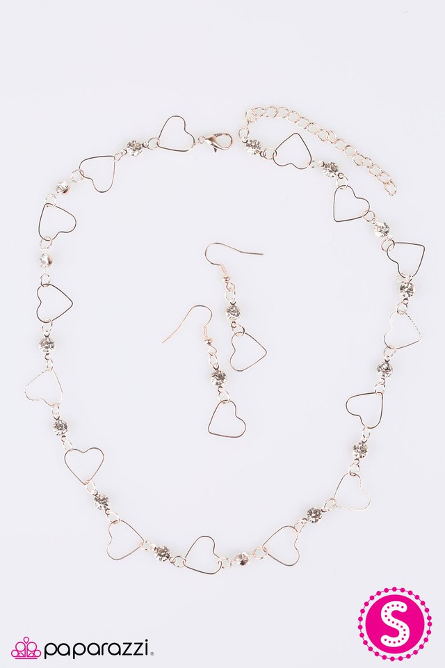Heart silhouettes join with white rhinestones below the collar in a delicate fashion. Brushed in a rose gold finish, the dainty display creates a timeless, minimalistic design. Features an adjustable clasp closure. Sold as one individual necklace. Includes one pair of matching earrings.