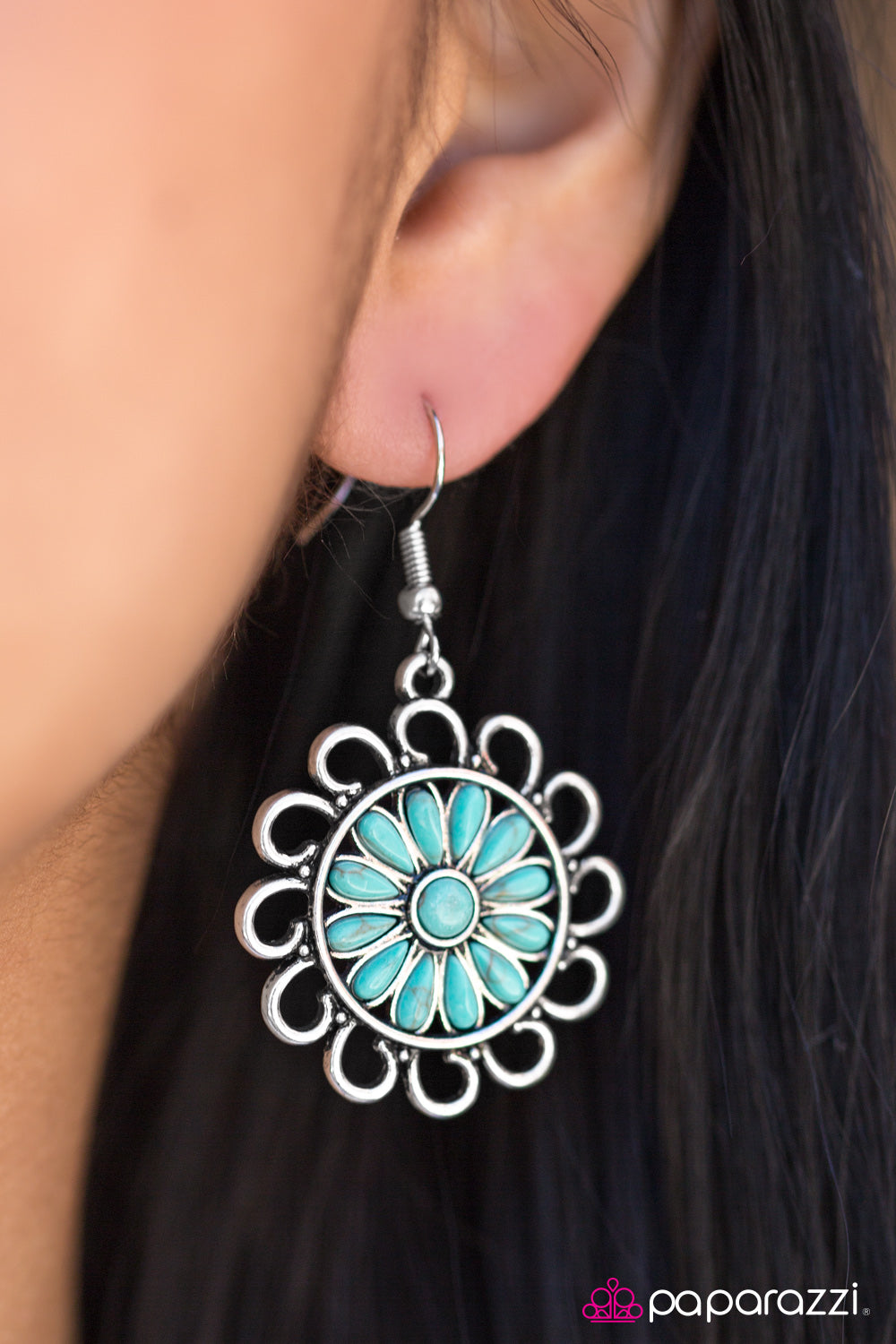 Refreshing turquoise stones are pressed into a frilly silver frame, creating a summery wildflower pattern for a seasonal finish. Earring attaches to a standard fishhook fitting.