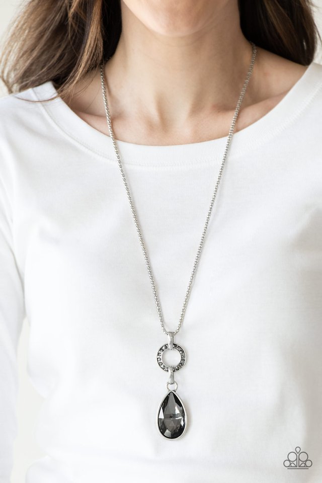Encrusted in glittery hematite rhinestones, a shimmery silver ring gives way to a dramatic smoky gem teardrop. The impressive pendant slides along a shimmery silver popcorn chain for a refined look. Features an adjustable clasp closure. Sold as one individual necklace. Includes one pair of matching earrings.