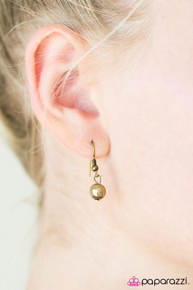Dainty brass beads and pearly brass beads trickle along a shimmery brass chain. Infused with a matching pearl center, a vintage inspired key charm swings from the bottom of the brass chain for a whimsical finish. Features an adjustable clasp closure. Sold as one individual necklace. Includes one pair of matching earrings.