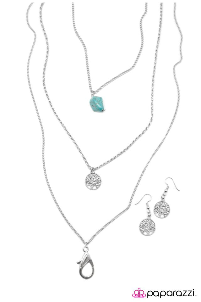 A turquoise stone is suspended above an enchanting tree charm for a whimsically layered display. A lobster clasp hangs from the bottom of the design to allow a name badge or other item to be attached. Features an adjustable clasp closure. Sold as one individual lanyard. Includes one pair of matching earrings.