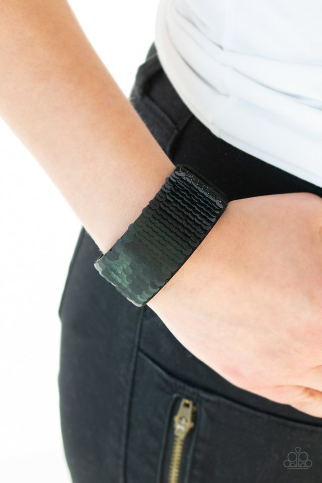 Row after row of shimmery sequins are stitched across the front of a black suede band. Bracelet features reversible sequins that change from black to multicolor. Features an adjustable snap closure. Sold as one individual bracelet.
